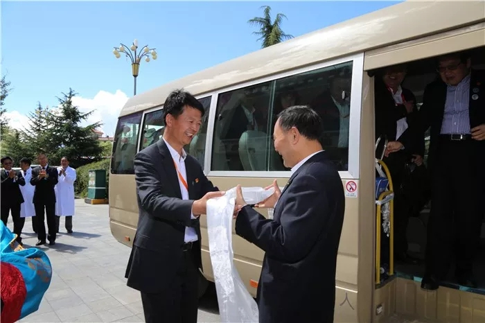 西藏阜康醫(yī)療股份有限公司黨委書記、董事長王斌同志為蒞臨阜康醫(yī)院考察指導(dǎo)的領(lǐng)導(dǎo)獻(xiàn)上哈達(dá)