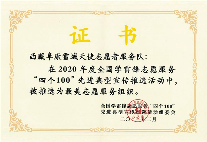 在2020年度全國學(xué)雷鋒志愿服務(wù)"四個(gè)100”先進(jìn)典型宣傳推選活動中,西藏阜康雪域天使志愿者服務(wù)隊(duì)榮獲"最佳志愿服務(wù)組織”榮譽(yù)稱號。