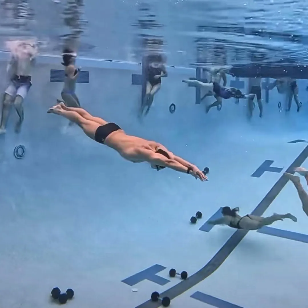 有意思的是,泳池中除了肆意暢游的游客,還能清晰看見(jiàn)不少健身達(dá)人在水下擼鐵、自由潛水、美人魚潛水、水中漫步、水下倒立走……