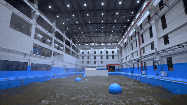 環(huán)境仿真方面,臺風訓練館配備了造浪球、風機、特制燈光、音響等設備,能夠讓場館內達到環(huán)境最大風力≥12級,最大降雨量≥50mm/h,最大環(huán)境噪音≥120db,最大造浪高度≥1.2m,基本復現(xiàn)最大12級臺風災害下,風、雨、浪等復雜的救援環(huán)境。