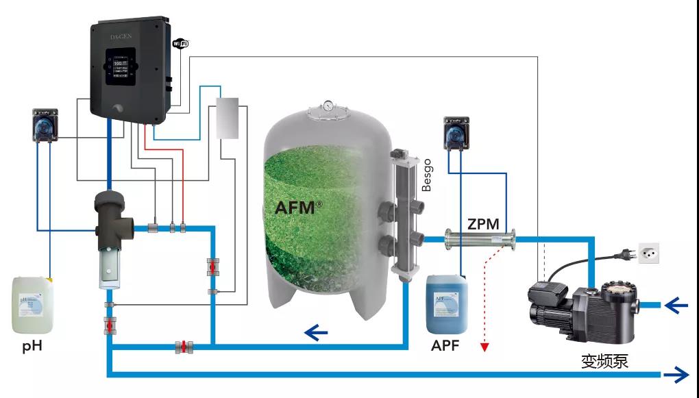 與將水質(zhì)消毒處理放在重要位置的傳統(tǒng)方法不同,它過(guò)多地依賴于水的消毒和消毒劑的使用。而游泳池低氯水處理系統(tǒng)利用水流動(dòng)力學(xué)特性,將科學(xué)設(shè)計(jì)放在首位,將循環(huán)過(guò)濾和反沖洗步驟則是設(shè)計(jì)中的重中之重,通過(guò)正確的循環(huán)過(guò)濾和反沖洗設(shè)計(jì),從根本上解決了影響水質(zhì)的主要因素,減少了游泳池對(duì)消毒劑的依賴。